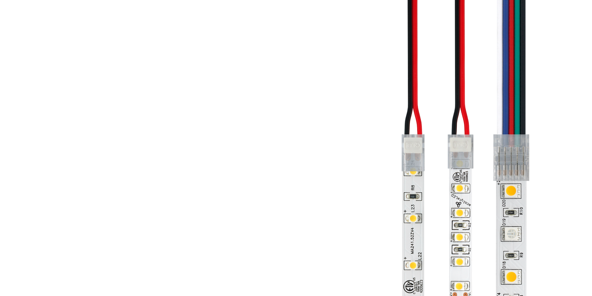 Solderless connectors can be used to join 2-conductor wire with Rapid Ribbon 95+ by Acolyte or to join 5-conductor wire with Rapid Ribbon RGBW. There are three types; one to connect 2-conductor wire to either 1.5 or 3.0 Rapid Ribbon 95+, one to connect 2-conductor wire to 5.0 Rapid Ribbon 95+, and one to connect 5-conductor wire to Rapid Ribbon RGBW. All Rapid Ribbon solderless connectors are IP20.