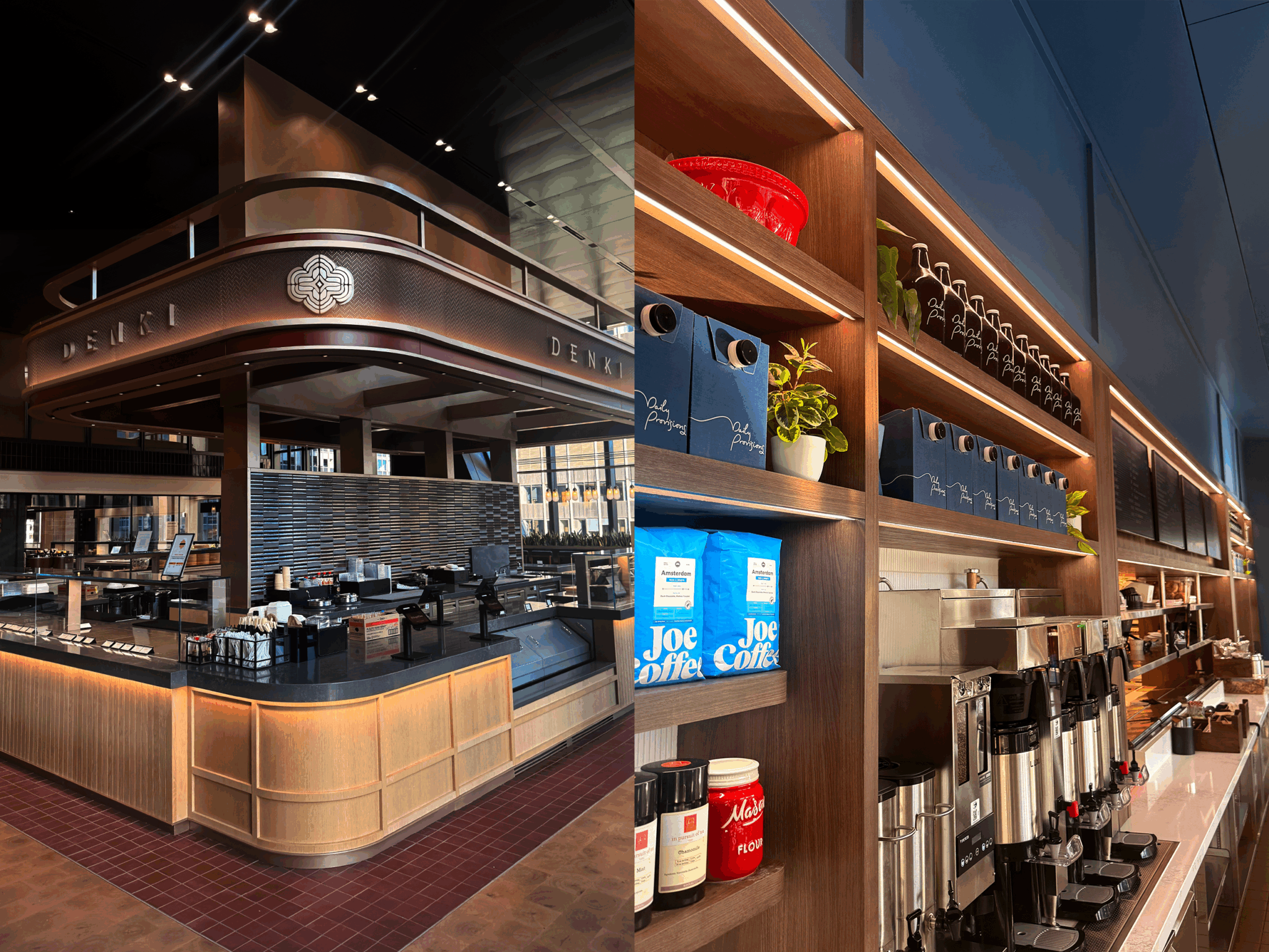 JPMorgan Chase has added a new two-story lounge for employees at their stunning Midtown office tower in New York City. Including posh eats and treats from stations like sweetgreen, vegetarian outpost “Little” Dirt Candy, Denki, the sleek Airstream-trailer themed Fuel Bar, The Corner, Starbucks and the Broad Street Deli, the high-end food court makes meals super convenient for busy bankers. Tillotson Design Associates specified Acolyte fixtures through our partners at Specification Lighting Sales throughout the project, including more than 1,800 feet of RibbonLyte fixtures featuring 6.0 Variable White Series 2 RibbonLyte, 4.4 Static White Series 2 RibbonLyte and 12.0 Variable White Double Row RibbonLyte, set in custom AS10, AS13, AC2, AC3 and AS20G channel fixtures. The JPMorgan Chase lighting also used some 600 ft of LED neon, including Static White Neon Apex and both Static White and Variable White Neon Silhouette Plus. Acolyte fixtures illuminate coves and under counters throughout the space, graze walls by the banquettes and create dramatic architectural lines in the escalator and atrium. At JPMorgan Chase, they make dreams possible. At Acolyte, we make custom lighting dreams reality!